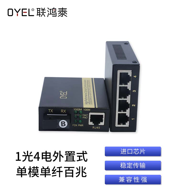 名称:单模单纤百兆外置式 1光4电 收发器 尺寸:95*70*26mm